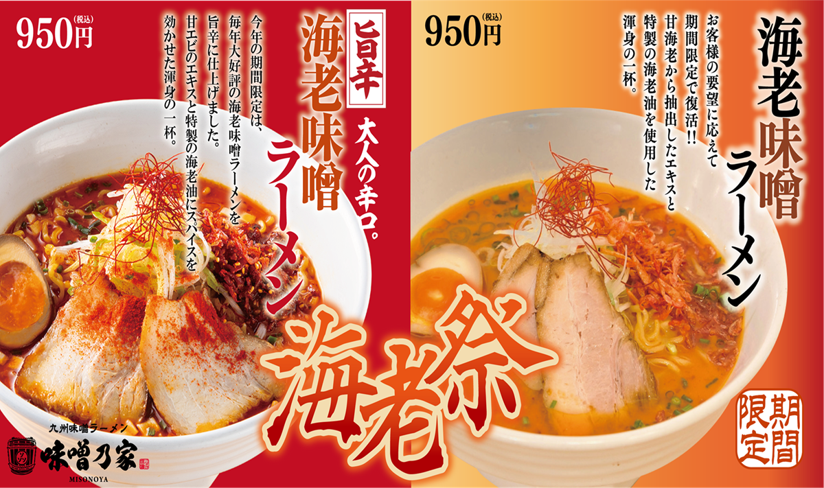 お待たせしました!今年の期間限定はお客様のご要望にお応えし毎年大好評の海老味噌を旨辛に仕上げました!甘エビから抽出したエキスと特製の海老油にスパイスを加えた渾身の一杯。是非ご賞味下さい!!